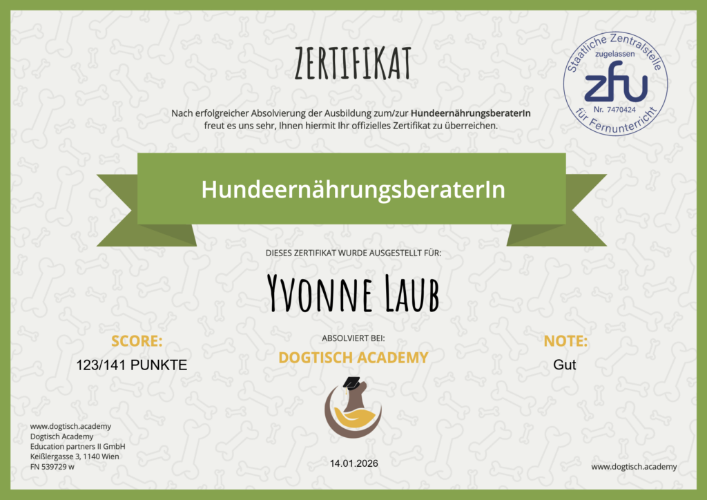 Diese persönlichen Erfahrungen prägen meine Arbeit bis heute. In meiner Ernährungsberatung betrachte ich jeden Hund ganzheitlich – individuell, bedarfsorientiert und alltagstauglich. Ob Trockenfutter, Nassfutter, BARF, selbst gekocht oder vegetarisch: Mein Ziel ist es, eine Fütterung zu finden, die wirklich zu deinem Hund passt.
